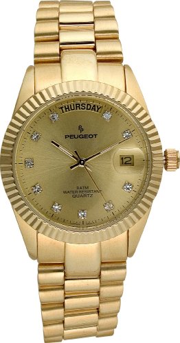 Peugeot mens round gold-tone bracelet watch. Crystal accent markers on dial, champagne dial with day-date calendar function. Adjustable bracelet Reviews